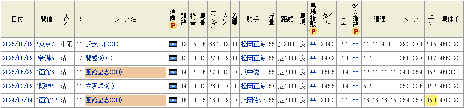 - 本馬が出走した函館記念でいえば、1着馬(ヴェローチェエラ)に迫れないとジャパンカップでは穴馬としても戦えないという印象