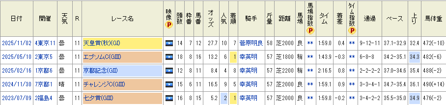 - 高速馬場の持続力勝負が持ち味だが、スローからの加速力勝負になり、適性面も微不利
