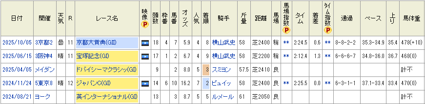 - 本馬に先着した馬はG1馬多数なことから、本馬もG1級のポテンシャルは相変わらず示した